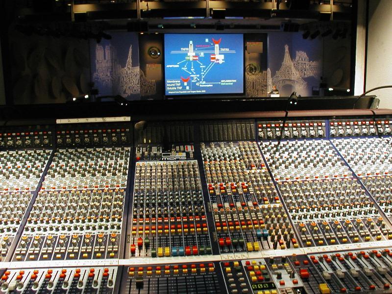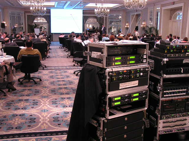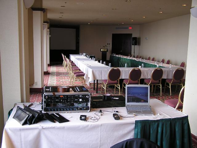 sound system including 56 channels of automatic microphone mixing for meeting.